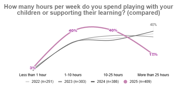 In 2025, time spent on these activities declined noticeably, with just 57% of dads reporting ten or more hours per week playing with their children or supporting their learning. And only 17% said they spend more than 25 hours weekly, representing a 20% drop compared with the last three-year average.