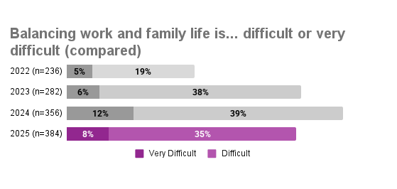 In 2024, just over half of dads (51%) reported that balancing work and family life was ‘difficult’ or ‘very difficult.’ This year, this figure dropped to 43%. Meanwhile, only 1 in 10 only 1 in 10 dads (9%) describe their work-life balance as ‘easy’ or ‘very easy’.