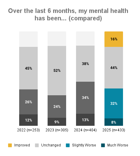 Dads reflected on their mental health over the past six months, with 40% reporting that their mental health had worsened. While this represents a slight improvement from last year, it remains higher than the figures for 2022 and 2023.