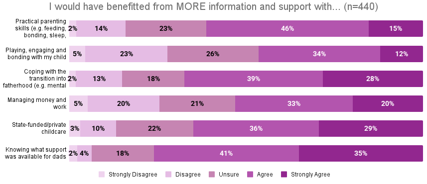 Interestingly our findings revealed that less than one-quarter told us that information from mum was the most helpful, suggesting that the information being passed from services through mum may not always be relatable, applicable, or tailored to the father's specific needs.