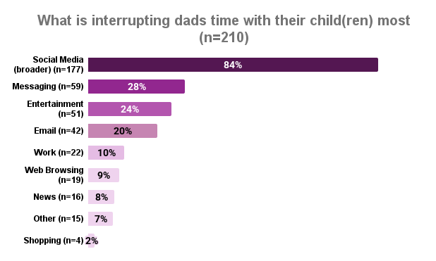 Out of all 430 fathers surveyed, 210 shared more detail about what was pulling them away from their children. Unsurprisingly, social media emerged as the primary source of digital distraction, with 84% of dads reporting that it interrupted their time.