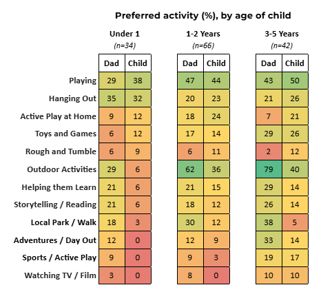Beyond physical play, it’s encouraging to see how much fathers enjoy supporting their child’s cognitive development. Among dads of 1-2-year-olds, 21% say helping their child learn is a favourite activity, with reading and storytelling close behind at 18%.